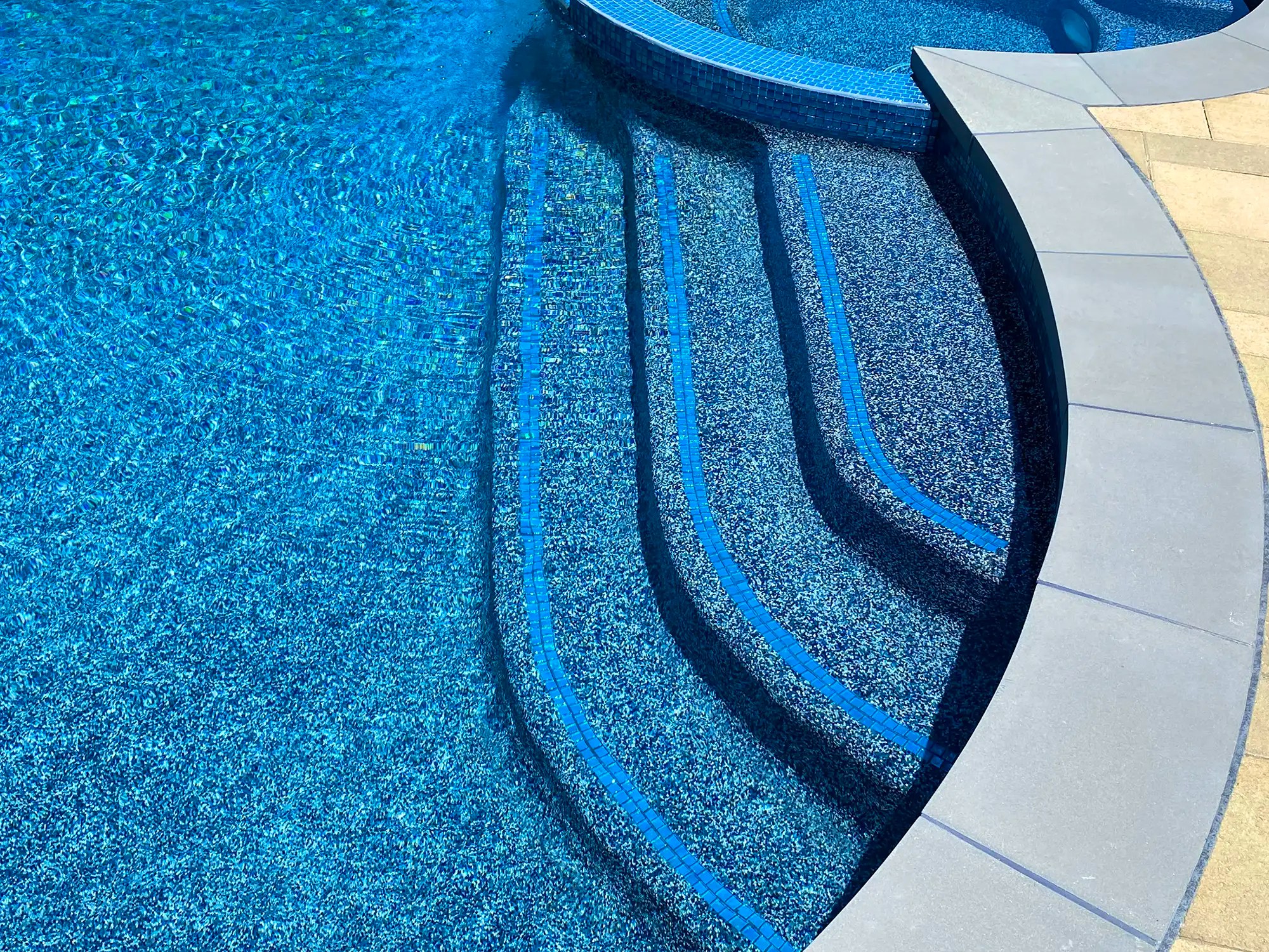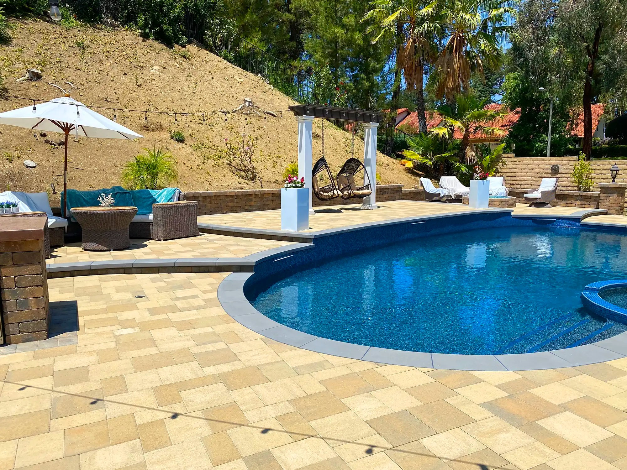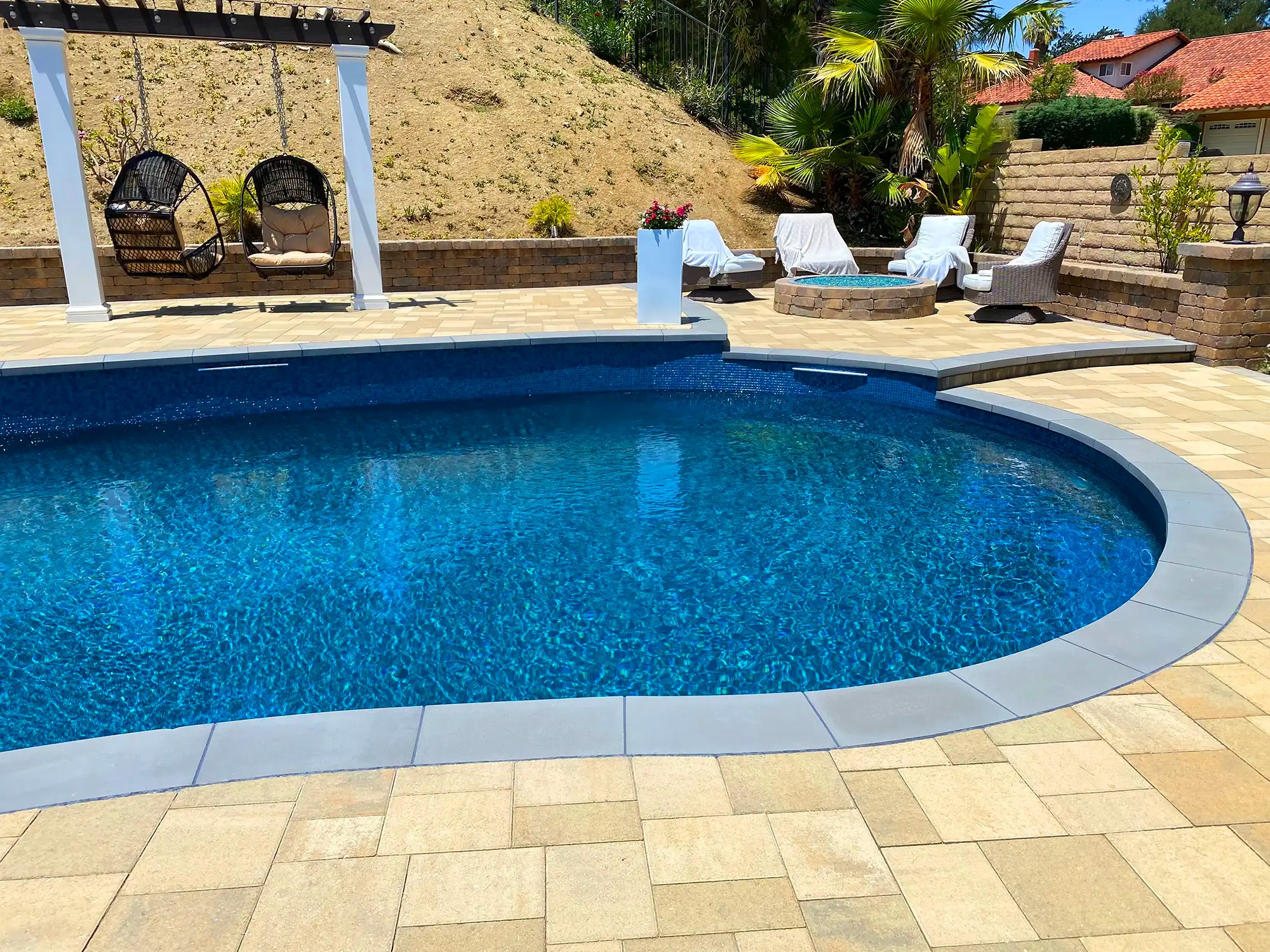 Featuring Light Grey Bellecrete Pre-Cast Coping with Galaxy Glass Photochormatic waterline tile and step trim tile. The pool/spa shell is finished in PebbleBrilliance “Majestic Sound” exposed-aggregate finish. Surrounded by Angelus Paseo Pavers.